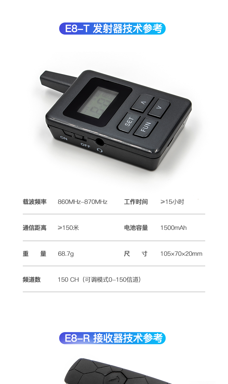 2、發射器使用 3.5 毫米音頻插頭麥克風作為音頻輸入來傳輸語音信號,以提高可靠性和耐用性,10 mW 的健康傳輸功率遠低于市場上的 100 mW 發射機;